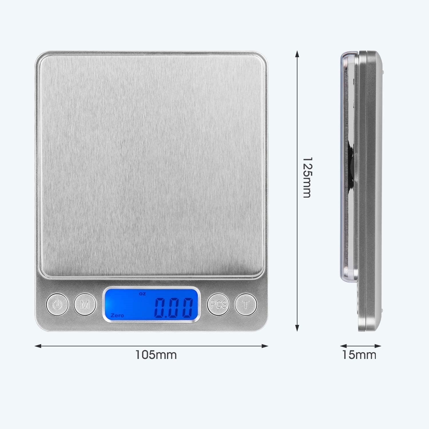 O chassis de plástico ABS e aço inoxidável da plataforma de pesagem torná-lo à prova de poeira e fácil de limpar. Ela vai ser o melhor ajudante não importa o que você está pesando, sejam jóias, moedas, artigos médicos, produtos químicos, artigos balísticos, erva, ou material de cozimento, etc.